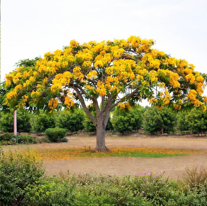 O Flamboyant Amarelo (Delonix regia sp.) é uma variante da conhecida árvore flamboyant, nativa de Madagascar. Sua copa em forma de guarda-chuva e flores amarelas intensas fazem dela um ícone em paisagismo tropical. O tronco forte e levemente retorcido suporta uma estrutura frondosa, que pode ser mais larga que alta, oferecendo sombra generosa. Amplamente cultivada em regiões tropicais e subtropicais, é uma escolha popular para criar pontos focais em jardins e áreas urbanas, destacando-se pela beleza e exuberância.