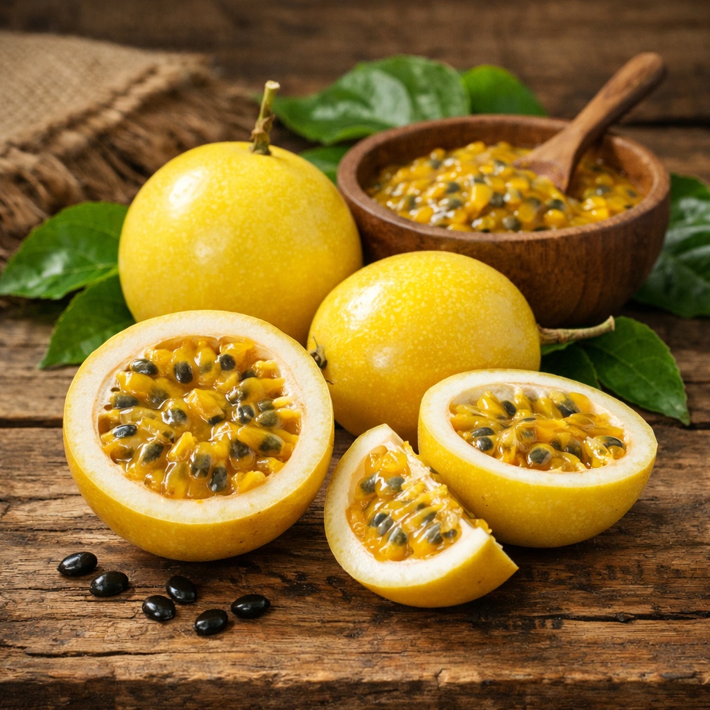 O Maracujá Azedo (Passiflora edulis), conhecido como “alimento na cuia” em tupi ou flor da paixão, é uma fruta tropical amplamente cultivada no Brasil. Suas propriedades terapêuticas incluem ação sedativa, ansiolítica, diurética e analgésica, sendo usado para tratar insônia, hipertensão, dores musculares e cólicas. A farinha de sua casca, rica em pectina, auxilia no emagrecimento e elimina toxinas. A flor do maracujazeiro, chamada de flor da paixão, inspira-se na simbologia cristã (coroa de espinhos, cinco chagas), e seu aroma é destaque em perfumes como o Hypnôse da Lancôme.