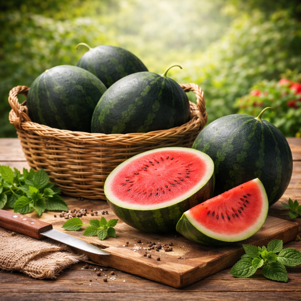 A Melancia Baby (Citrullus lanatus) é uma fruta rasteira originária da África, da mesma família da abóbora e do pepino. Sua polpa vermelha, doce e com alto teor de água a torna uma sobremesa refrescante para o verão. Rica em vitaminas do complexo B, cálcio, fósforo e ferro, é uma opção saudável e versátil, ideal para consumo ao natural, sucos ou compotas. Sua casca verde brilhante com estrias escuras adiciona charme visual à horta e à mesa.