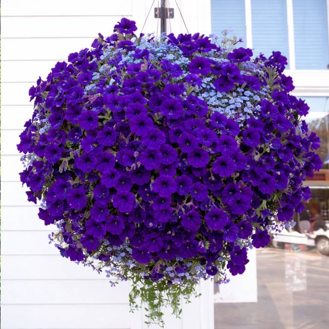 Palavras-chave: Petúnia Eagle Blue, petúnia azul profundo, petúnia cascata, vasos suspensos, azul verdadeiro.