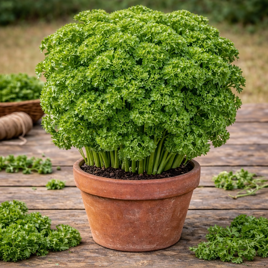 Cultive a clássica Salsa Crespa Tempero (Petroselinum crispum) com 100 sementes de alta qualidade! Esta variedade de folhas crespas e bem franjadas é a mais usada na culinária brasileira. Produz folhas verde-escuras, aromáticas e saborosas, perfeitas para temperar feijão, arroz, carnes, saladas, sopas, molhos e refogados. A planta é bienal, atinge 30–50 cm e continua produzindo por meses se colhida regularmente pelas folhas externas. Rica em vitamina C, K, ferro e antioxidantes.