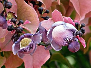 A Sapucaia (Lecythis pisonis) é uma árvore decídua característica da floresta pluvial atlântica, especialmente no sul da Bahia e norte do Espírito Santo. Suas flores roxas ou violetas surgem entre setembro e outubro, junto com novas folhas de cor rosa ou lilás, criando um espetáculo visual. Os frutos lenhosos, conhecidos como “cumbuca-de-macaco”, abrem-se naturalmente para liberar castanhas comestíveis, muito apreciadas pela fauna e em comunidades locais. A madeira pesada e resistente é amplamente usada em construções externas devido à sua durabilidade.